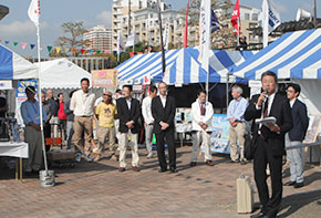 冒頭の実行委員長、ご後援いただいている国土交通省神戸運輸管理課長の挨拶に続いて新西宮ヨットハーバー社長の挨拶は、日本ラグビーの大躍進や日本人のノーベル賞受賞などの嬉しいニュースに触れた後、回復傾向にある景気に加えて今年はイベント開催期間すべて「晴れ」の予報という好機に、過去最高の来場者数を期待する内容で締めくくられた。