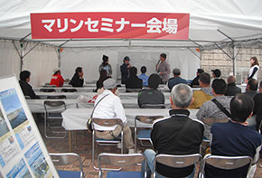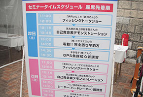例年併設されるマリン用品の展示コーナーや「フィッシングトークショー」、「GPS魚探初心者講習」、「レーダー(バードレーダー)講習会」などのマリンセミナーも人気で、今年は第五管区海上保安本部による「自己救命策デモンストレーション」も行われた。実際にライフジャケットを着用したまま海に落ちた際の自己救命索について、来場者は興味深く講師の話に耳を傾けていた。