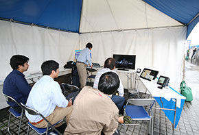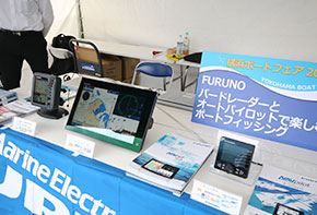 ベイサイドマリーナ陸上テントブースには、最新鋭のGPS魚探などの展示の他、SR-320FBに搭載された「船外機艇で有りながらジョイスティック1本で360度自由自在にボートを動かせる」ヘルムマスターを体験できるコーナーも用意され、体験した方は皆ヘルムマスターの便利さに驚いていた。