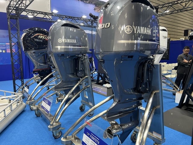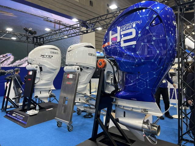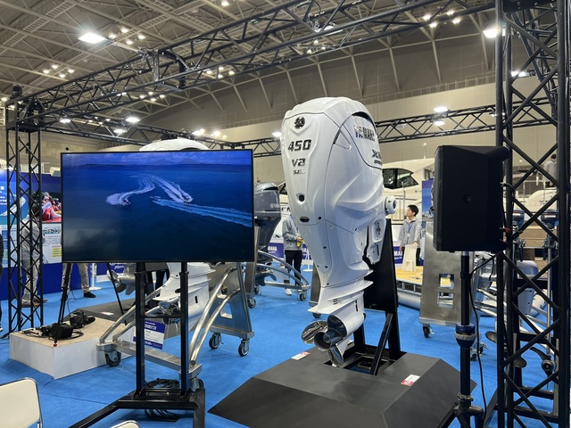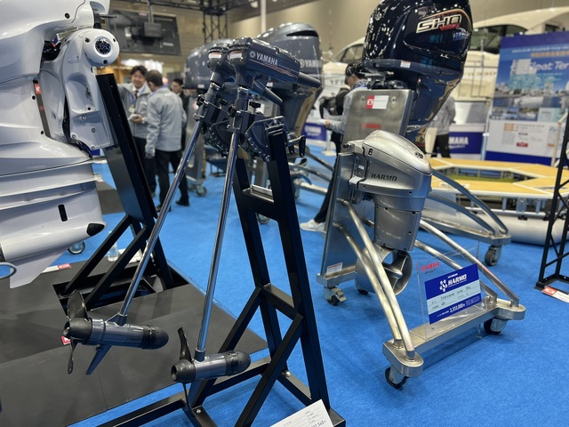 船外機コーナーではフラッグシップモデル「F450A」に加え、次世代の「水素エンジン」や電動推進器「HARMO」が披露されていた。