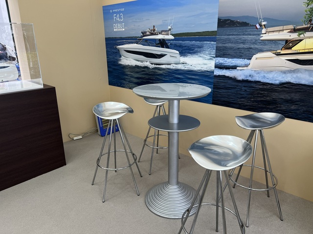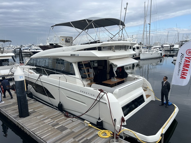 注目は、国内のボートショーで初お披露目となった「PRESTIGE F4.3」。その洗練されたフォルムを一目見ようと、多くの来場者が足を止めていた。